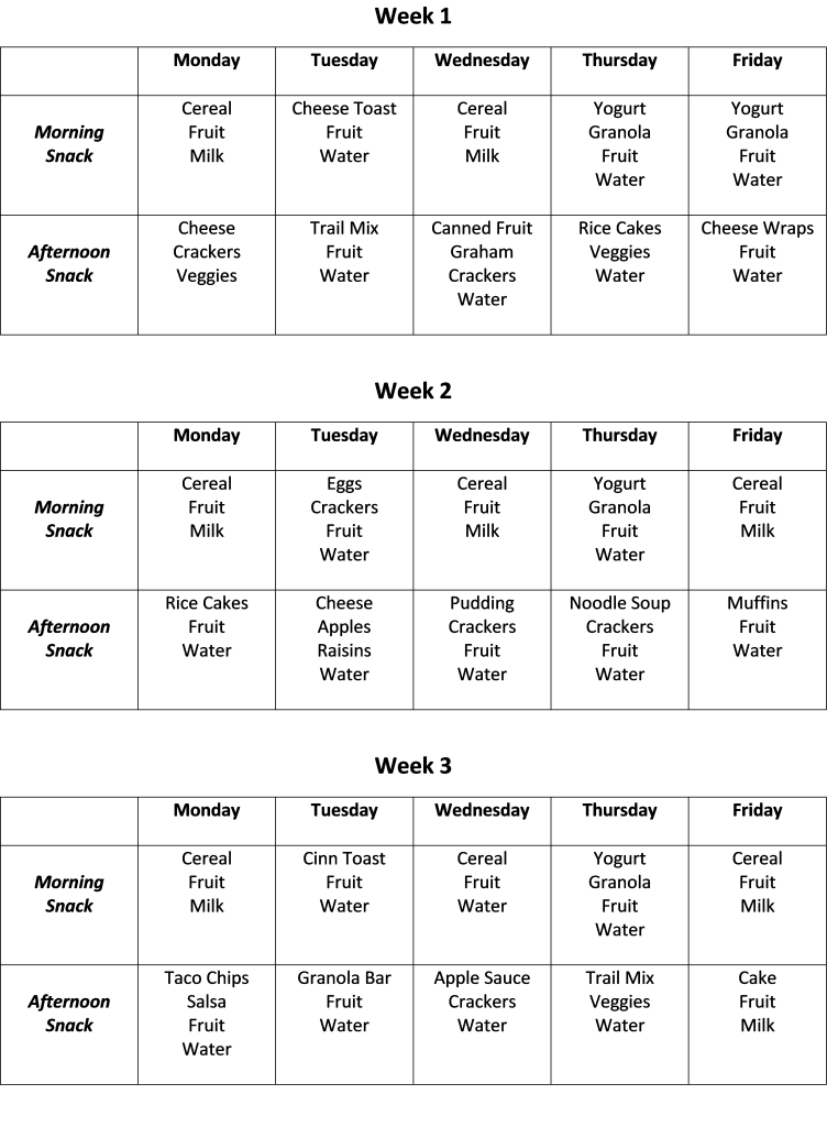Hot Dogs, Tater Tots, Fresh Vegetables, Fruit, Dessert, Milk.